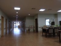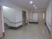 2階が居住フロアになっており、エレベーターを降りると正面に食堂・団らんスペースを兼ねた共同生活室が広がっています。共同生活室と居室に通じる廊下は天井がとても高く、また鉄筋コンクリートで構造がしっかりしているので、開放感と落ち着いた安心感があります。